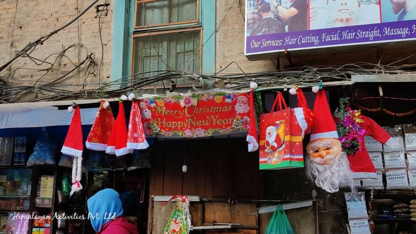 古い建物の軒先に、売り物のクリスマスグッズが飾られているカトマンズ旧市街アサン。 このギャップが楽しい!