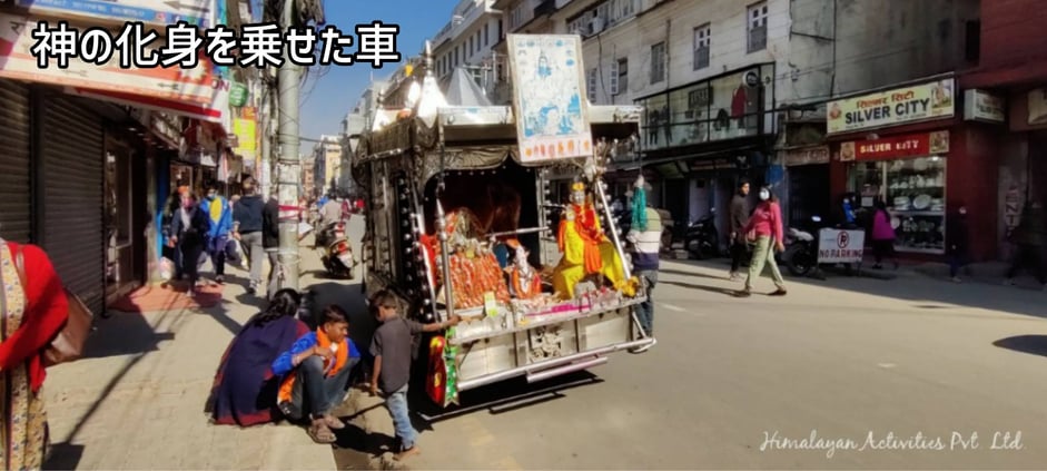カトマンズ市内を巡回する、神の化身を乗せた派手な乗り物。中には、下半身が二つに分かれた牝牛が載せられている。 いわゆる奇形なのだが、ネパールでは忌み嫌うことなく神として崇る。 ご利益にあずかろうと、牛に触れたり寄付を捧げたりする人がたくさん。