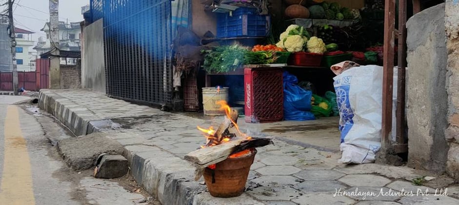 焚き火で暖を取る光景があちこちで見られるネパールの冬。 日の出前から開いている、カトマンズ住宅街にある小さな商店前でも、早朝だけこんな風に火を焚き、道行く人が手をかざす様子が見られます。